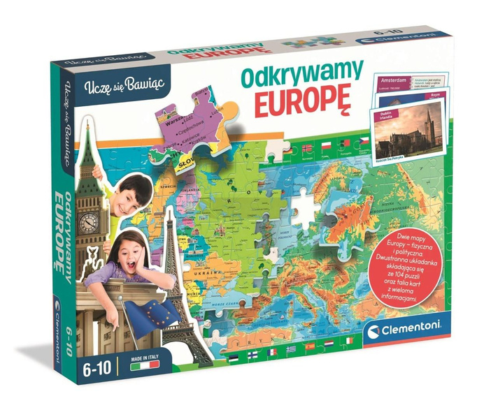 Uczenie się geografii Europy jeszcze nigdy nie było tak zabawne! Wewnątrz opakowania znajdziecie dwustronną układankę z fizyczną i polityczną mapą Europy oraz rysunkami wszystkich flag europejskich. Ponadto do zestawu dołączona jest talia kart, którą możecie grać i uczyć się przy okazji nazw głównych stolic europejskich oraz poznawać dane na temat ludności i powierzchni krajów.