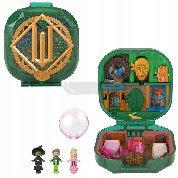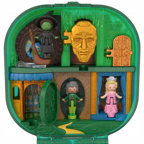 Po otwarciu zobaczysz kultowe lokalizacje z Uniwersytetu Shiz i Szmaragdowego Miasta, trzy mikrolalki – Elfabę, Glindę i Czarodzieja – oraz dwa akcesoria tematyczne.