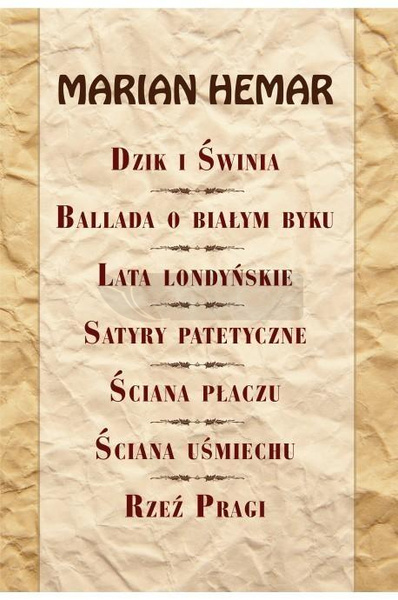 Na niniejszy tom składa się siedem wydanych pierwotnie osobno tomików poetyckich Mariana Hemara: Dzik i Świnia (Lwów 1922), Ballada o białym byku (Lwów, 1923), Lata londyńskie (Londyn 1946), Satyry patetyczne (Londyn 1947), Ściana płaczu (Londyn 1968), Ściana uśmiechu (Londyn 1968) oraz Rzeź Pragi (Londyn 1968). Zostały one przygotowane przez samego autora i opublikowane za jego życia, dlatego zbiór, który trzymają Państwo w dłoniach, zachowuje ich kolejność chronologiczną oraz oryginalny układ utworów w obrębie każdego z tomików. Są one przecież ważnym punktednego z najbardziej znanych i lubianych poetów polskich XX wieku.