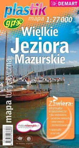 Bardzo atrakcyjna cena, wytrzymałość oraz szczegółowość to główne cechy charakteryzujące nową serię map foliowanych.Polecane dla turystów pieszych, rowerowych, konnych i zmotoryzowanych. Dzięki zastosowaniu nowatorskiej technologii mapa jest foliowana w całości, w dużym formacie. Mapa Wielkich Jezior Mazurskich w skali 1:77 000 zawiera informator krajoznawczy: dla wodniaków, turystów pieszych, rowerowych i zmotoryzowanych, rezerwaty przyrody