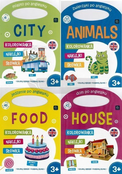 Format: A4. Liczba kartek: 16. Okładka pokryta błyszczącym lakierem. Kolorowanka tematyczna łącząca zabawę z nauką języka angielskiego dla dzieci powyżej 3. roku życia. Zawiera kolorowanki, naklejki i zadania pomagające w poznaniu i utrwaleniu słownictwa w języku angielskim. W serii znajdują się: Animals, City, Food, House.