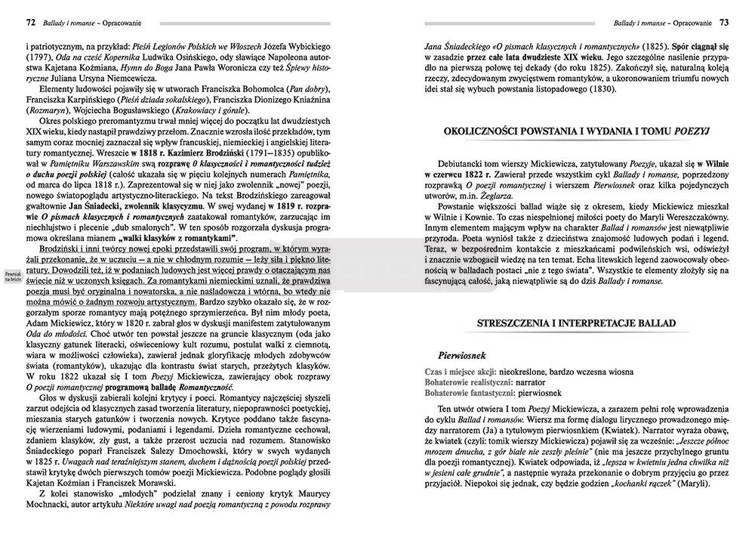 Wydanie Ballad i romansów kompletne bez skrótów i cięć w treści. W tym wydaniu znajdziesz odpowiedzi na pytania z podręcznika - pewniak na teście, czyli wskazanie zagadnień, które zwykle pojawiają się w pytaniach z danej lektury we wszelkich testach sprawdzających wiedzę, a także w podręcznikach i na klasówkach. Zawiera bardzo szczegółowe streszczenie oraz drugie skrócone, ułatwiające szybkie przygotowanie się przed lekcją. Opracowanie zawiera plan wydarzeń, wnikliwie wyjaśnioną problematykę oraz szerokie charakterystyki bohaterów.