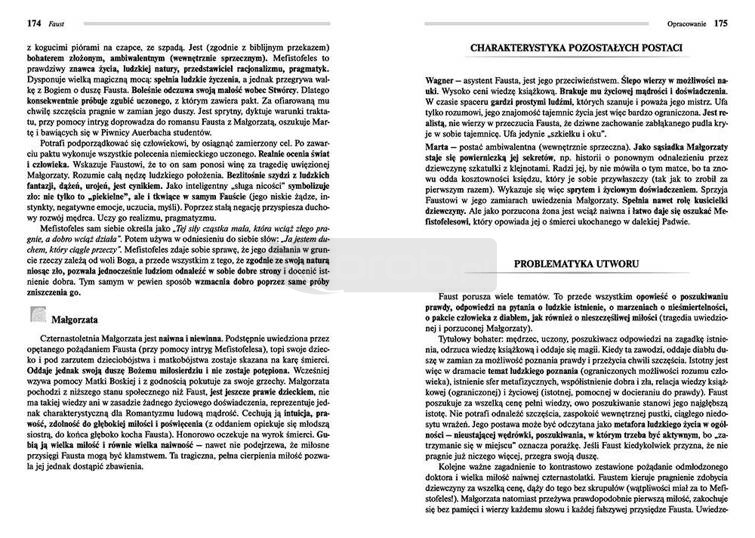 Wydanie Fausta kompletne bez skrótów i cięć w treści. W tym wydaniu znajdziesz odpowiedzi na pytania z podręcznika - pewniak na teście, czyli wskazanie zagadnień, które zwykle pojawiają się w pytaniach z danej lektury we wszelkich testach sprawdzających wiedzę, a także w podręcznikach i na klasówkach. Zawiera bardzo szczegółowe streszczenie oraz drugie skrócone, ułatwiające szybkie przygotowanie się przed lekcją. Opracowanie zawiera plan wydarzeń, wnikliwie wyjaśnioną problematykę oraz szerokie charakterystyki bohaterów.