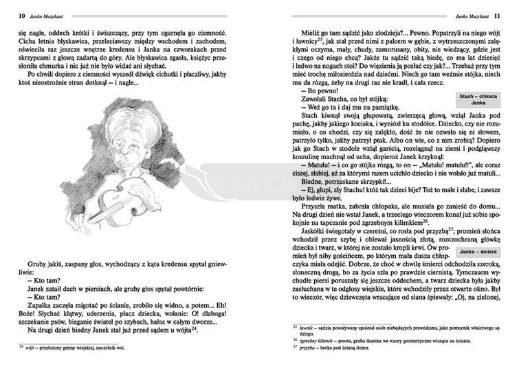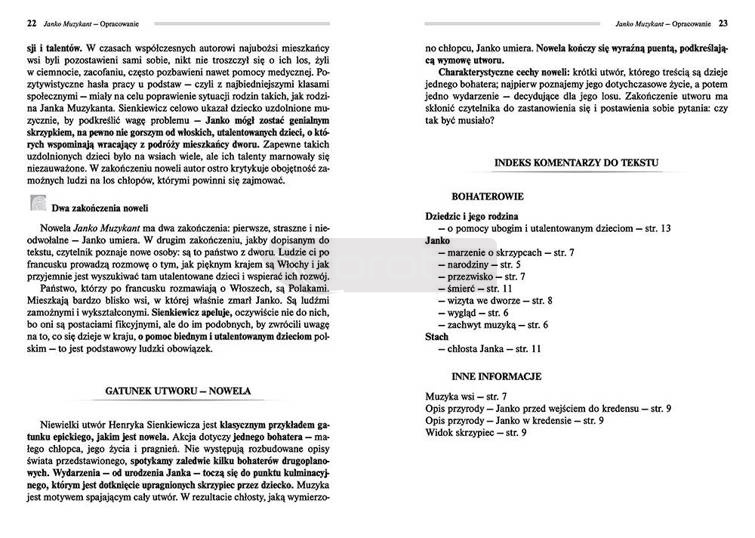 Wydanie Janka Muzykanta kompletne bez skrótów i cięć w treści. W tym wydaniu znajdziesz odpowiedzi na pytania z podręcznika - pewniak na teście, czyli wskazanie zagadnień, które zwykle pojawiają się w pytaniach z danej lektury we wszelkich testach sprawdzających wiedzę, a także w podręcznikach i na klasówkach. Zawiera bardzo szczegółowe streszczenie oraz drugie skrócone, ułatwiające szybkie przygotowanie się przed lekcją. Opracowanie zawiera plan wydarzeń, wnikliwie wyjaśnioną problematykę oraz szerokie charakterystyki bohaterów.
