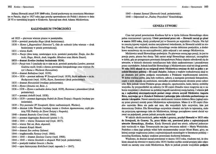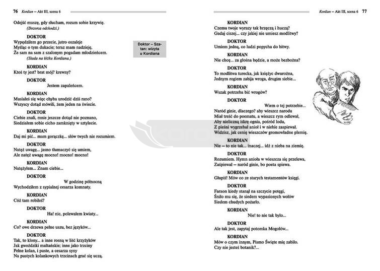 Wydanie Kordiana kompletne bez skrótów i cięć w treści. W tym wydaniu znajdziesz odpowiedzi na pytania z podręcznika - pewniak na teście, czyli wskazanie zagadnień, które zwykle pojawiają się w pytaniach z danej lektury we wszelkich testach sprawdzających wiedzę, a także w podręcznikach i na klasówkach. Zawiera bardzo szczegółowe streszczenie oraz drugie skrócone, ułatwiające szybkie przygotowanie się przed lekcją. Opracowanie zawiera plan wydarzeń, wnikliwie wyjaśnioną problematykę oraz szerokie charakterystyki bohaterów.