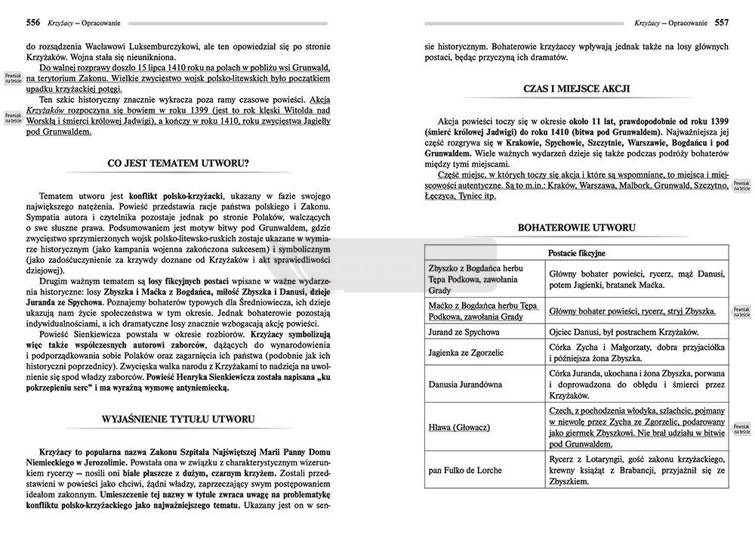 Wydanie Krzyżaków kompletne bez skrótów i cięć w treści. W tym wydaniu znajdziesz odpowiedzi na pytania z podręcznika - pewniak na teście, czyli wskazanie zagadnień, które zwykle pojawiają się w pytaniach z danej lektury we wszelkich testach sprawdzających wiedzę, a także w podręcznikach i na klasówkach. Zawiera bardzo szczegółowe streszczenie oraz drugie skrócone, ułatwiające szybkie przygotowanie się przed lekcją. Opracowanie zawiera plan wydarzeń, wnikliwie wyjaśnioną problematykę oraz szerokie charakterystyki bohaterów.