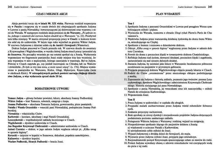 Wydanie Ludzi bezdomnych kompletne bez skrótów i cięć w treści. W tym wydaniu znajdziesz odpowiedzi na pytania z podręcznika - pewniak na teście, czyli wskazanie zagadnień, które zwykle pojawiają się w pytaniach z danej lektury we wszelkich testach sprawdzających wiedzę, a także w podręcznikach i na klasówkach. Zawiera bardzo szczegółowe streszczenie oraz drugie skrócone, ułatwiające szybkie przygotowanie się przed lekcją. Opracowanie zawiera plan wydarzeń, wnikliwie wyjaśnioną problematykę oraz szerokie charakterystyki bohaterów.