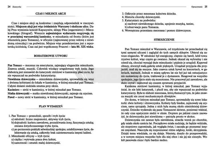 Wydanie Katarynki kompletne bez skrótów i cięć w treści. W tym wydaniu znajdziesz odpowiedzi na pytania z podręcznika - pewniak na teście, czyli wskazanie zagadnień, które zwykle pojawiają się w pytaniach z danej lektury we wszelkich testach sprawdzających wiedzę, a także w podręcznikach i na klasówkach. Zawiera bardzo szczegółowe streszczenie oraz drugie skrócone, ułatwiające szybkie przygotowanie się przed lekcją. Opracowanie zawiera plan wydarzeń, wnikliwie wyjaśnioną problematykę oraz szerokie charakterystyki bohaterów.