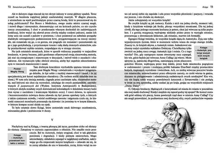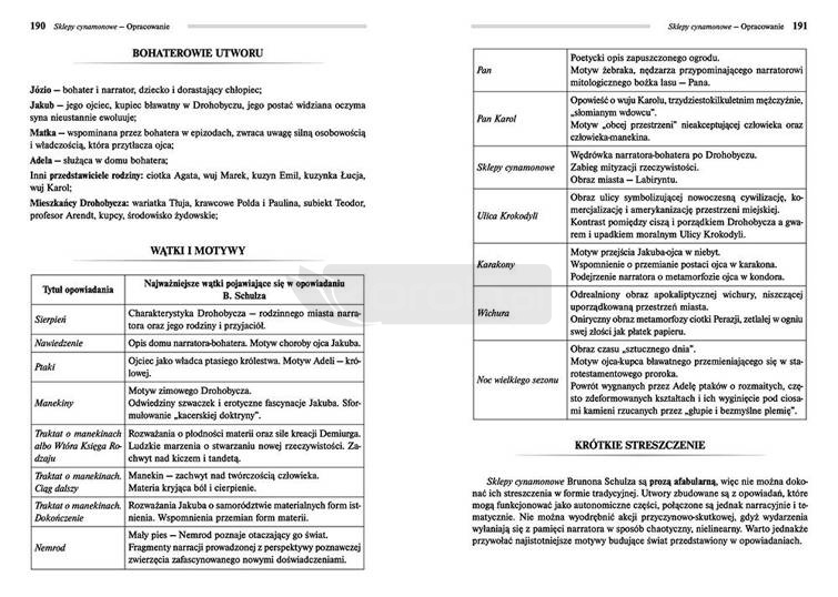 Wydanie Sklepów cynamonowych i Sanatorium pod Klepsydrą kompletne bez skrótów i cięć w treści. W tym wydaniu znajdziesz odpowiedzi na pytania z podręcznika - pewniak na teście, czyli wskazanie zagadnień, które zwykle pojawiają się w pytaniach z danej lektury we wszelkich testach sprawdzających wiedzę, a także w podręcznikach i na klasówkach. Zawiera bardzo szczegółowe streszczenie oraz drugie skrócone, ułatwiające szybkie przygotowanie się przed lekcją. Opracowanie zawiera plan wydarzeń, wnikliwie wyjaśnioną problematykę oraz szerokie charakterystyki bohaterów.