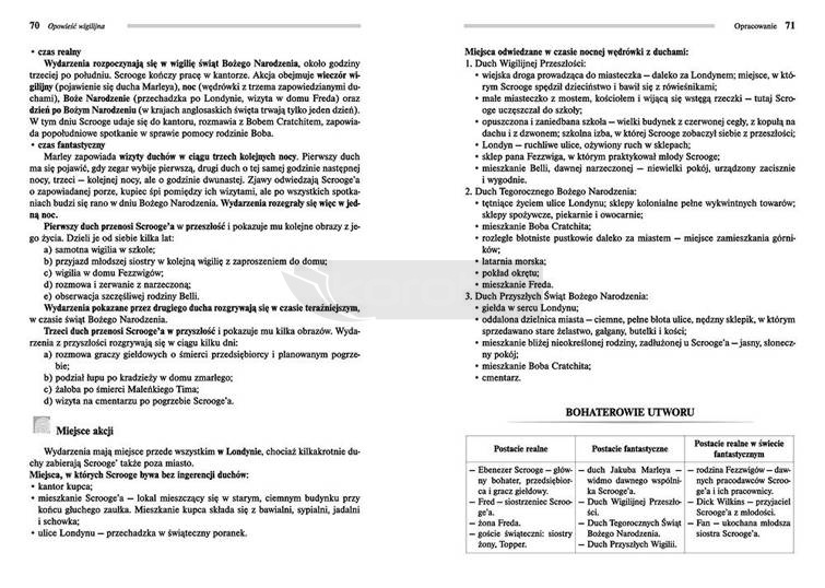 Wydanie Opowieści wigilijnej kompletne bez skrótów i cięć w treści. W tym wydaniu znajdziesz odpowiedzi na pytania z podręcznika - pewniak na teście, czyli wskazanie zagadnień, które zwykle pojawiają się w pytaniach z danej lektury we wszelkich testach sprawdzających wiedzę, a także w podręcznikach i na klasówkach. Zawiera bardzo szczegółowe streszczenie oraz drugie skrócone, ułatwiające szybkie przygotowanie się przed lekcją. Opracowanie zawiera plan wydarzeń, wnikliwie wyjaśnioną problematykę oraz szerokie charakterystyki bohaterów.