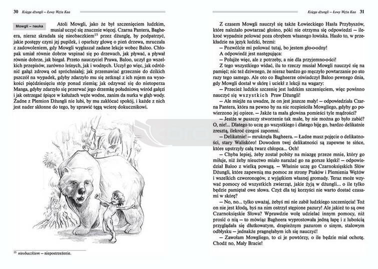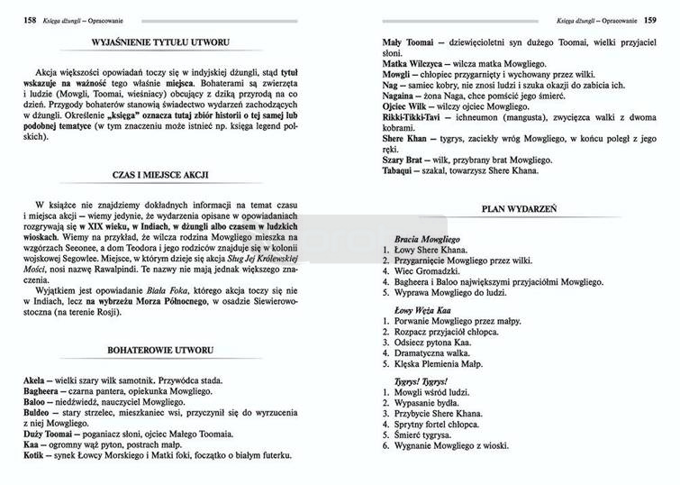 Wydanie Księgi dżungli kompletne bez skrótów i cięć w treści. W tym wydaniu znajdziesz odpowiedzi na pytania z podręcznika - pewniak na teście, czyli wskazanie zagadnień, które zwykle pojawiają się w pytaniach z danej lektury we wszelkich testach sprawdzających wiedzę, a także w podręcznikach i na klasówkach. Zawiera bardzo szczegółowe streszczenie oraz drugie skrócone, ułatwiające szybkie przygotowanie się przed lekcją. Opracowanie zawiera plan wydarzeń, wnikliwie wyjaśnioną problematykę oraz szerokie charakterystyki bohaterów.