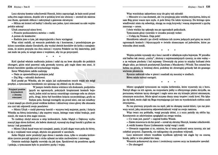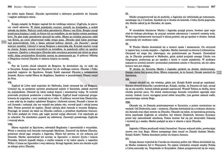 Wydanie Krzyżaków kompletne bez skrótów i cięć w treści. W tym wydaniu znajdziesz odpowiedzi na pytania z podręcznika - pewniak na teście, czyli wskazanie zagadnień, które zwykle pojawiają się w pytaniach z danej lektury we wszelkich testach sprawdzających wiedzę, a także w podręcznikach i na klasówkach. Zawiera bardzo szczegółowe streszczenie oraz drugie skrócone, ułatwiające szybkie przygotowanie się przed lekcją. Opracowanie zawiera plan wydarzeń, wnikliwie wyjaśnioną problematykę oraz szerokie charakterystyki bohaterów.