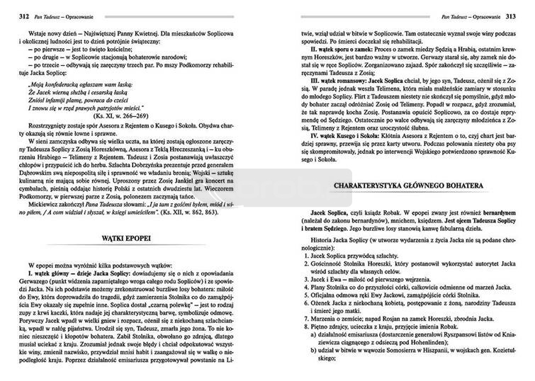 Wydanie Pana Tadeusza kompletne bez skrótów i cięć w treści. W tym wydaniu znajdziesz odpowiedzi na pytania z podręcznika - pewniak na teście, czyli wskazanie zagadnień, które zwykle pojawiają się w pytaniach z danej lektury we wszelkich testach sprawdzających wiedzę, a także w podręcznikach i na klasówkach. Zawiera bardzo szczegółowe streszczenie oraz drugie skrócone, ułatwiające szybkie przygotowanie się przed lekcją. Opracowanie zawiera plan wydarzeń, wnikliwie wyjaśnioną problematykę oraz szerokie charakterystyki bohaterów.