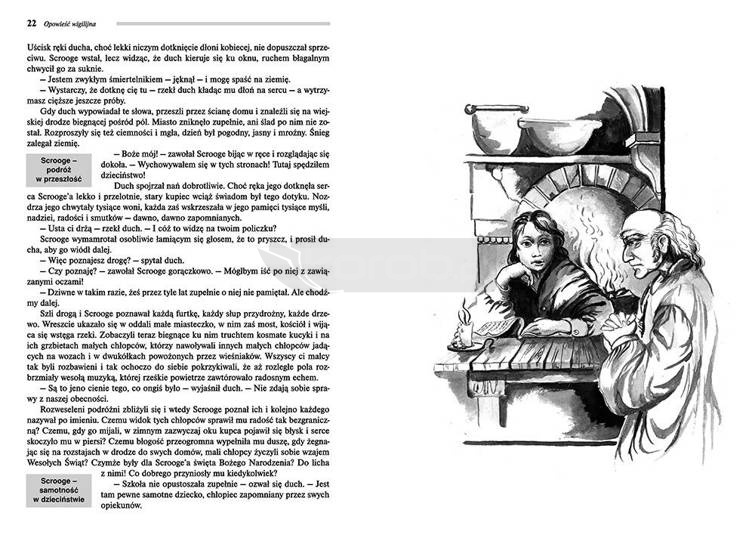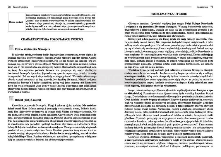 Wydanie Opowieści wigilijnej kompletne bez skrótów i cięć w treści. W tym wydaniu znajdziesz odpowiedzi na pytania z podręcznika - pewniak na teście, czyli wskazanie zagadnień, które zwykle pojawiają się w pytaniach z danej lektury we wszelkich testach sprawdzających wiedzę, a także w podręcznikach i na klasówkach. Zawiera bardzo szczegółowe streszczenie oraz drugie skrócone, ułatwiające szybkie przygotowanie się przed lekcją. Opracowanie zawiera plan wydarzeń, wnikliwie wyjaśnioną problematykę oraz szerokie charakterystyki bohaterów.