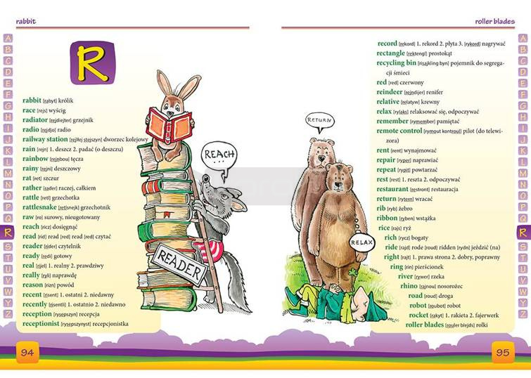 Cały słowniczek zawiera w części angielsko-polskiej około 6 000 haseł, a jako jedyny na rynku posiada cześć polsko-angielską. Wszystkie słówka mają podany uproszczony sposób wymowy, by każde dziecko wiedziało, jak dane słówko przeczytać. Dodatkowym atutem są pięknie ilustrowane plansze tematyczne - kolory, rodzina, ubrania, części ciała.