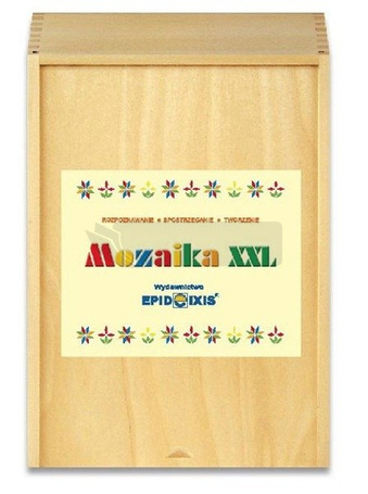 Któż z nas nie zna Mozaiki, jedni zetknęli się z nią w przedszkolu inni w szkole a jeszcze inni otrzymali ją w prezencie, teraz jest już nowa Mozaika w rozmiarze XXL to aż 250 drewnianych elementów w kolorach: czerwonym, zielonym, niebieskim, żółtym, pomarańczowym i białym, podobnie jak jej ,,mniejsza siostra" opakowana jest w estetycznym i trwałym drewnianym pudełku o wymiarach 295 mm x 215 mm x 75mm.