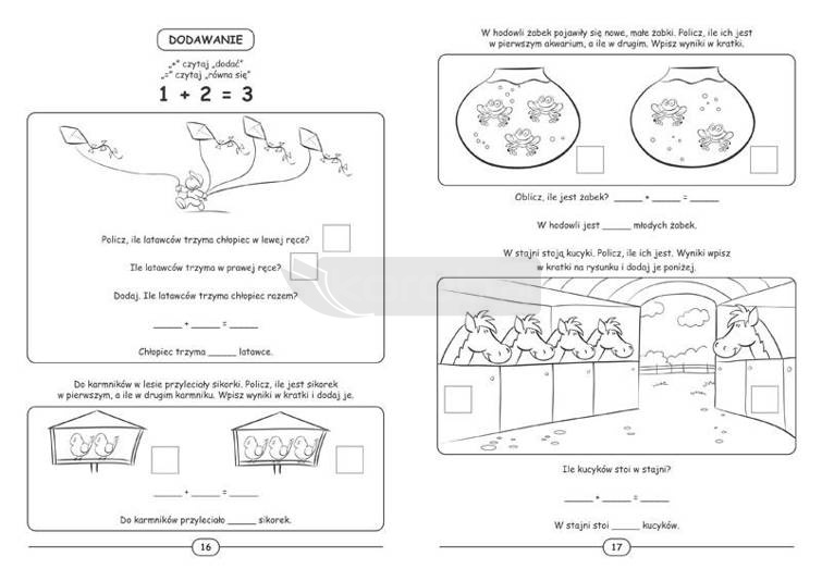 W książeczce zostały też zaprezentowane podstawy dodawania i odejmowania. Dodatkowym atutem książki są wesołe, kolorowe naklejki wielokrotnego użytku.