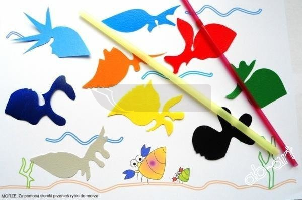 Zadaniem dziecka jest przenoszenie za pomocą słomki małe kolorowe elementy na wskazane miejsca kolorowych plansz, np. rybki do morza, krople deszczu nad parasolkę, plamki na szyję żyrafy.
