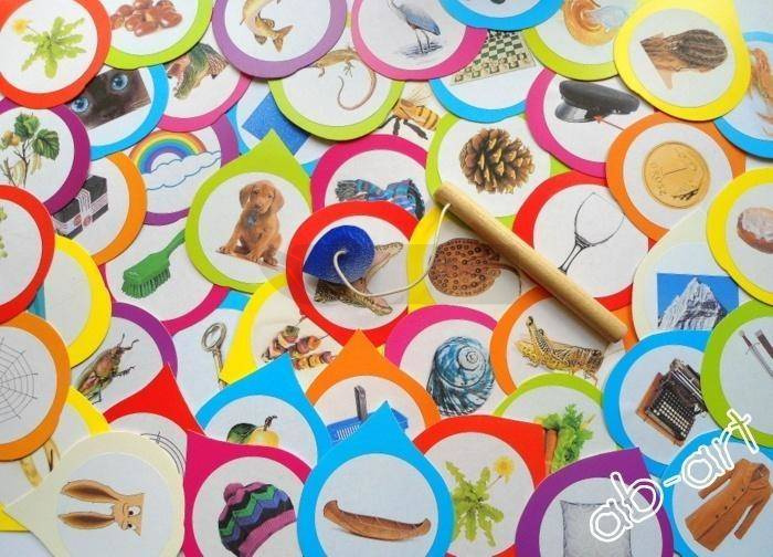 W zestawie znajduje się 48 kolorowych kropli deszczu z magnesami i naklejonymi obrazkami, w których nazwie występują ćwiczone głoski.