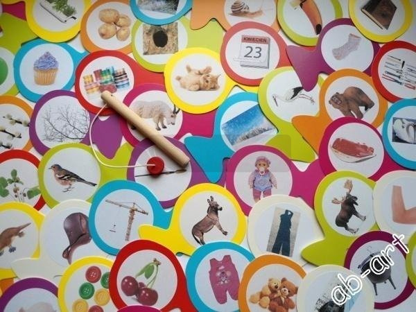Kolorowe rybki można łowić za pomocą wędki zaopatrzonej w magnes, głośno i wyraźnie nazywając obrazki.