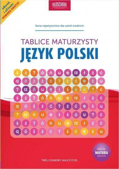 Potrzebujesz korepetycji z języka polskiego? Powtórki przed maturą? Szybkiej pomocy przed klasówką? Język polski. Tablice maturzysty to idealna powtórka z polskiego dla maturzystów w formie wygodnych i przejrzystych tablic. Seria "OLDSCHOOL - stara dobra szkoła" została przygotowana przez doświadczonych korepetytorów i metodyków, a wszystkie publikacje są konsultowane z nauczycielami i poddawane testom przez samych maturzystów.