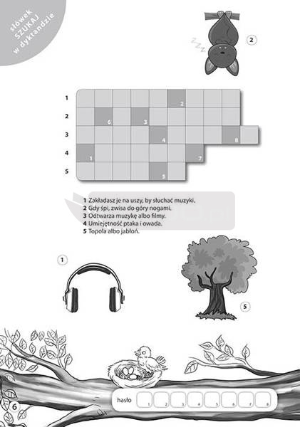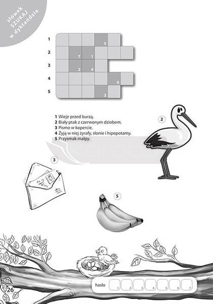 Dyktanda ułożone są od najprostszego do najtrudniejszego, co zostało oznaczone wyraźną skalą trudności. Do każdego dyktanda zamieszczona została krzyżówka, w której znajdują się hasła z tekstu - zastosowano w niej podpowiedzi dwóch rodzajów: słowne opisy oraz rysunki. Dzięki krzyżówkom dziecko jeszcze raz powtarza pisownię.
