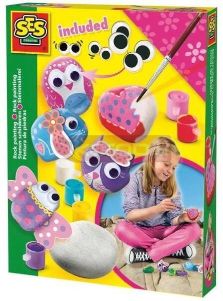 Kamyki do własnoręcznego pomalowania i ozdobienia. Dzięki oferowanemu zestawowi każde dziecko będzie mogło wykreować dowolny obrazek na kamieniu, czy doklejając oczka, uszka, skrzydełka, zamienić go w zwierzątko. Malowanie Kamieni to kreatywna zabawa pobudzająca dziecięcą wyobraźnię. Zestaw zawiera 5 kamyków, naklejki "ruszające się oczka", farby, klej, pędzelek.